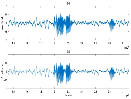 (a) Audio signal corrupted by Gaussian Noise. (b) Filtered Audio signal.