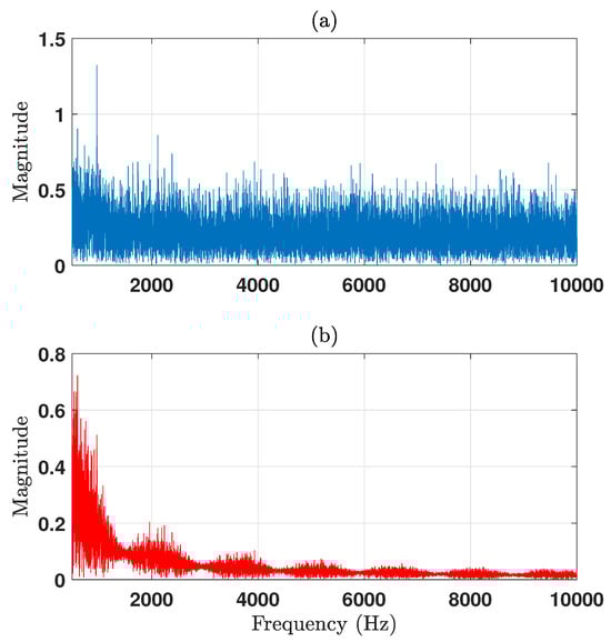 (a) FFT of Audio signal corrupted by Gaussian noise. (b) FFT of filtered audio signal.