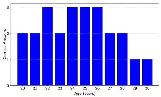 Figure 4 presents a comparison between the time-domain signals and the filter’s response. However, due to the complexity of time-domain analysis, it is more effective to examine the system’s frequency response using the Fast Fourier Transform (FFT) of both the noise-corrupted and desired signals. The FFT results are shown in Figure 5, where a significant reduction in noise is observed, particularly within the frequency range most sensitive to the human ear (3–5 kHz). Figure 5 further illustrates the attenuation of Gaussian random noise across the 1 kHz to 10 kHz range. A noise attenuation of 20 dB in terms of SNR was achieved, with a step size of . Figure 6 shows the distribution of data obtained from the Blind Test, categorized by participant age and their ability to correctly identify the filtered signal compared to the noise-corrupted one (choices A and B). In the experiment, each participant was given only one opportunity to listen to each signal, thus eliminating any potential bias from repetition. The experimental results indicated that, overall, 80% of the participants correctly selected the filtered signal, reflecting a high success rate in identifying the enhanced signal. However, an interesting trend emerged among the older participants (closer to 30 years of age), who exhibited a higher error rate compared to younger participants. This finding suggests that, despite the improvement in SNR provided by the LMS algorithm, factors such as age could influence the ability to correctly identify the signal, possibly due to differences in auditory perception or adaptation to signal processing technologies. Figure 7 illustrates the proportion of correct responses across all participants, highlighting the high rate of correct selections but also emphasizing the variation in performance based on age. Finally, Figure 8 presents the frequency distribution of participants ages, who were randomly selected within the 20 to 30 year-old range. This age range allowed for an equitable examination of the potential relationship between age and performance on the test.