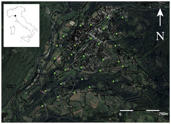 Satellite image of the study area (Fivizzano, Massa-Carrara Province, Tuscany Region, Italy, 44°14′ N, 10°07′ E) showing the distribution of 30 recording stations. The regions enclosed by the white line represent areas of recent urban development.