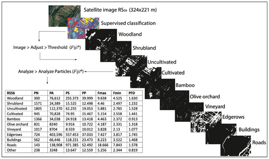 Definitively, a specific folder was used for each image containing the classified image in 8-bit, and all eleven 8-binary images for each cover class, when present. Every separate LCC obtained with the previous procedures was submitted to a shape analysis using the command sequence Analyze > Analyze particles, obtaining landscape indices as described in Table 1.