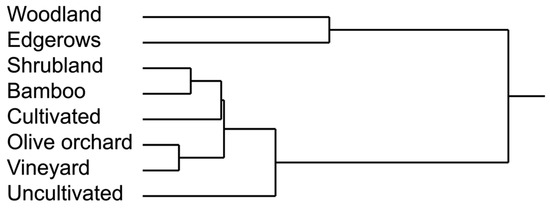 Cluster analysis, based on the seven landscape indices (PA, PN, PS, PP, Fmax, Fmin, and PFD), excluding “roads”, “buildings”, and “other”, revealed an aggregation where woodlands, edgerows, and uncultivated areas represented the most distinct landcover categories. Shrublands and bamboo groves fell within the same cluster, while olive orchards and vineyards grouped together (Figure 3).