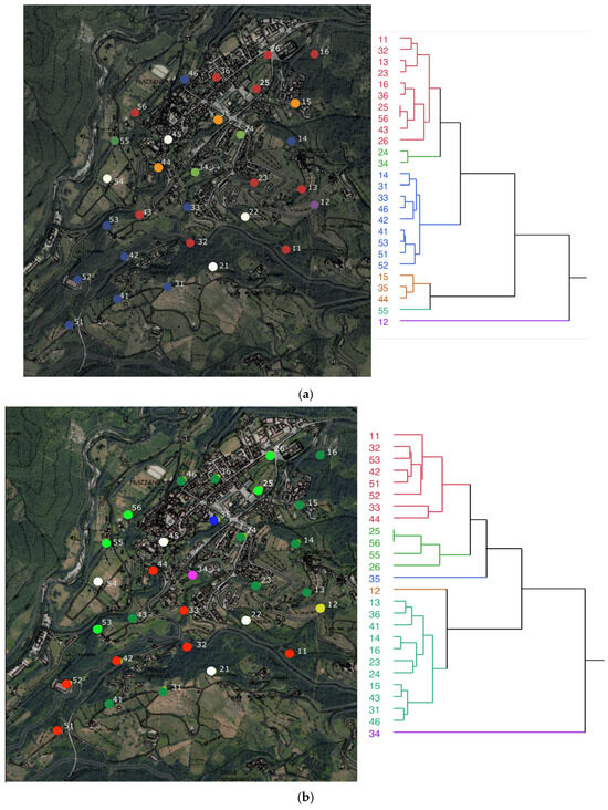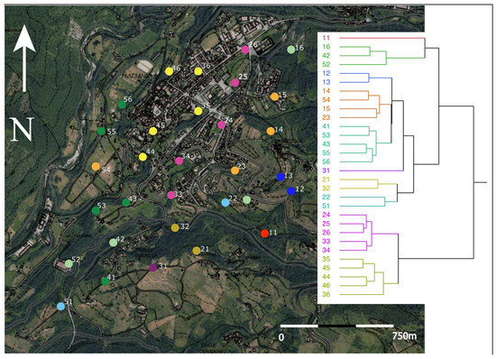 Aggregation based on a 10-cluster model of the recording stations (RSs), according to the landscape characteristics of Table S3. Each cluster branch is marked with a different color, and the same colors are used in the maps to indicate the aggregation categories among the RS.