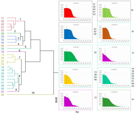 There was a strong correspondence between cluster groupings and the average SHItf among RSs, especially for frequencies < 2000 Hz, confirming that the separation of these two frequency ranges provided a valuable representation of sonic and spatial variability in the soundscape (Table 3).
