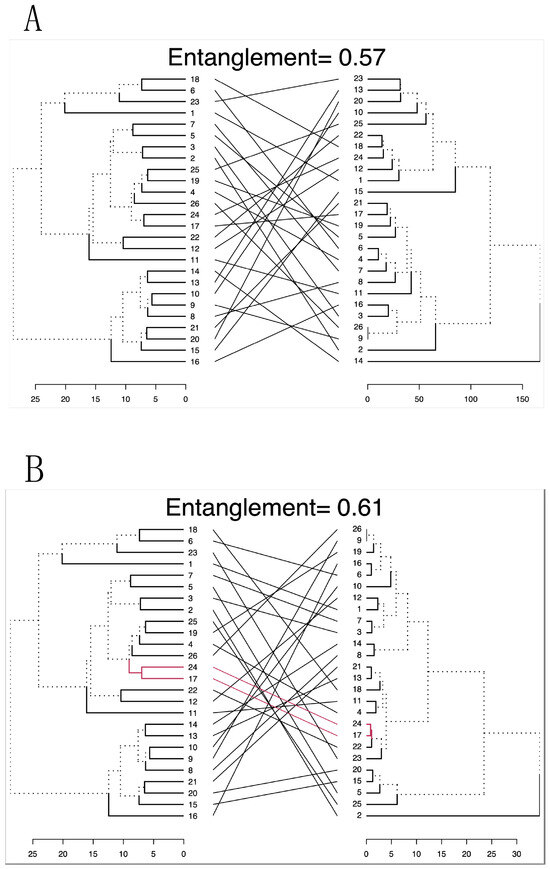 The dendextend package, the entanglement and cor.dendlist functions [49] operating in R [50], were used to visualize the alignment between the Spectral Sonic Signature and landscape variables in a dendrogram, with the degree of association measured by Goodman–Kruskal’s gamma coefficient (γ) [51,52]. The γ coefficient ranges between −1 and +1. The closer γ is to ±1, the stronger the positive or negative association, respectively. Conversely, the closer γ is to 0, the weaker the association, with 0 indicating no association. This analysis allowed us to determine whether the landscape variables measured at recording stations were associated with the complexity and concentration of sonic information distributed across frequency bins. The entanglement is a measure that ranges from 1 (full entanglement) to 0 (no entanglement).