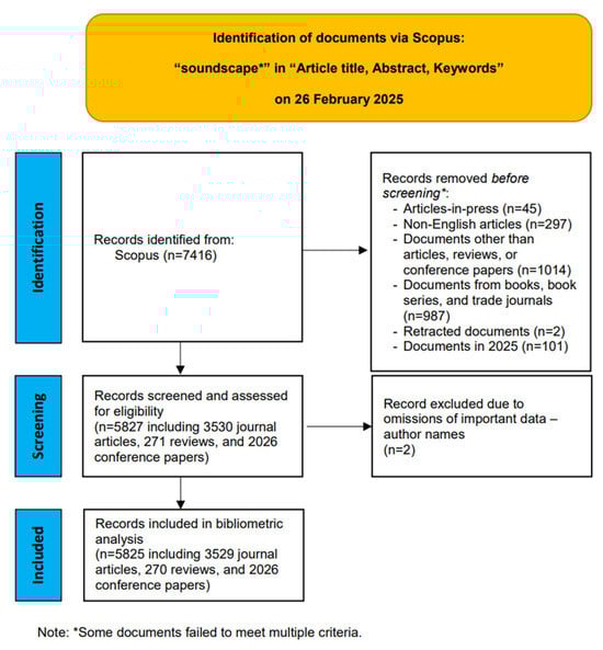 A literature search was conducted in Scopus on 26 February 2025, using “soundscape*” within “Article title, Abstract, Keywords”. The search query used in Scopus was (TITLE-ABS-KEY (soundscape*)). This search yielded a total of 7416 documents, comprising 3903 articles, 312 reviews, 2187 conference papers, 641 book chapters, 134 books, 111 conference reviews, 41 notes, 37 editorials, 21 errata, 13 short surveys, 9 data papers, 5 letters, and 2 retracted papers. Out of these documents, 7371 were in the final publication stage, while 45 were articles in press. In terms of source type, 4346 were obtained from journals, 2083 from conference proceedings, 676 from books, 299 from book series, and 12 from trade journals. In terms of language, 7119 were in English, and 297 were in other languages such as Spanish, Chinese, Portuguese, German, and French. Upon refining the search to include only articles, reviews, and conference papers in English, from journals and conference proceedings, in the final publication stage, and up to the year 2024, 5827 documents were retained, consisting of 3530 articles, 271 reviews, and 2026 conference papers. The bibliographical information, abstracts, keywords, citation details, as well as other relevant information such as funding sources and references, of these 5827 documents were exported as a csv file. The documents were thoroughly examined for significant information such as author names and source titles. Author names were missing in one journal article and one review. Therefore, 5825 documents were included in the analysis. Figure 1 shows the method used in the study that closely adhered to the Preferred Reporting Items for Systematic Reviews and Meta-Analyses (PRISMA 2020) [64].