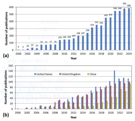 Figure 2. The number of publications on soundscape (a) between 2000 and 2024, and (b) from the three most productive countries between 2000 and 2024.