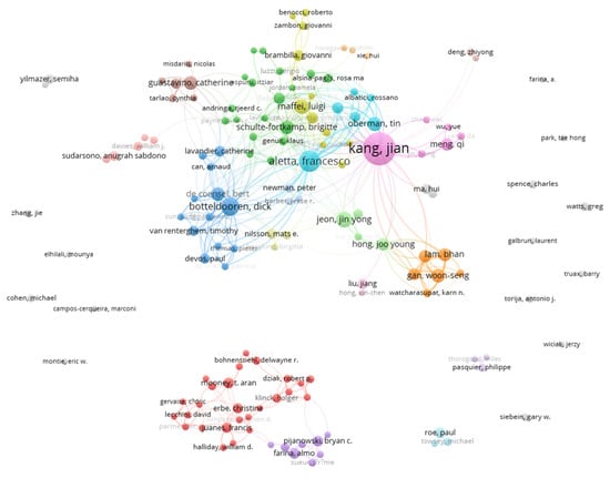 Co-authorship analyses were conducted using VOSviewer at the individual level. When the analysis was based on authors with 5 or more publications, 464 out of the total 12,164 authors met the threshold. However, when the minimum number of publications required was set to 10, only 157 authors met the threshold. Among the authors who met the threshold, J. Kang ranked first with 265 documents, followed by F. Aletta with 113 documents and D. Botteldooren with 84 documents. Figure 3 and its associated table provide further insights into the collaborations of J. Kang, showing that he frequently collaborated with F. Aletta (83 publications), T. Oberman (46 publications), A. Mitchell (29 publications), Q. Meng (23 publications), and S. Torresin (14 publications).