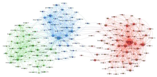The analysis of the co-occurrence of keywords, i.e., all keywords, was conducted on all 5825 publications using VOSviewer. When the threshold for the number of keyword co-occurrences was set to 50, 156 out of the 22,724 identified keywords met the criteria. These keywords formed three distinct clusters: Cluster 1 consisted of 76 keywords, Cluster 2 had 53 keywords, and Cluster 3 contained 27 keywords. Figure 5 visually presents the three clusters: Cluster 1 in red, Cluster 2 in green, and Cluster 3 in blue.