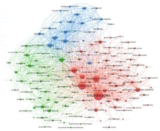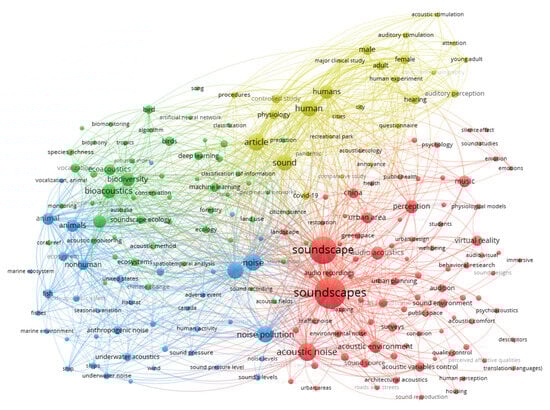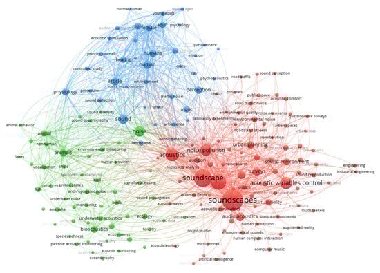 Cluster 1 focuses on the soundscape and its impacts on the acoustic environment and urban planning in general. Cluster 2 delves into the effect of noise on animals, including fish and birds, and how noise influences their bioacoustic responses. Cluster 3 centers around human perceptions of sound and their physiological responses. These clusters can be labeled as follows: Cluster 1—“soundscape(s), acoustic environment, and urban planning”, Cluster 2—“noise, animal(s), bioacoustics, biodiversity, fish, and bird(s)”, and Cluster 3—“human(s), sound, perception, and physiology”.