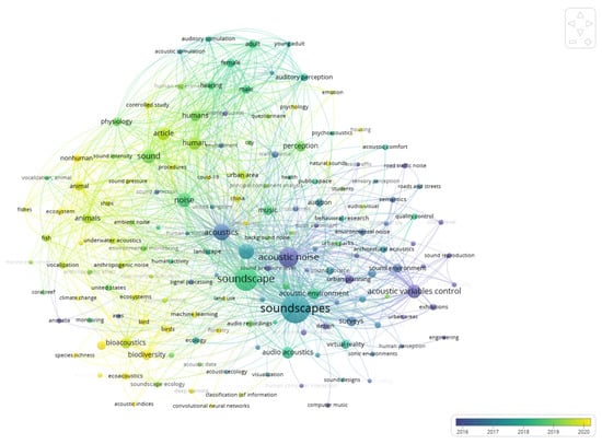 An analysis of keyword co-occurrences was conducted on 2545 documents published between 2010 and 2019, with a minimum co-occurrence set to 20. Out of the 12,082 keywords identified, 186 met the threshold, resulting in the formation of three clusters as shown in Figure 8. The largest cluster, highlighted in color, consisted of 90 items focusing on soundscape(s), urban planning, environmental noise, audio acoustics, and virtual reality. The second cluster, highlighted in green, included 56 items related to bioacoustics, biodiversity, ecology, underwater acoustics, fish, animal(s), and non-human. The third cluster, highlighted in blue, comprised 40 items covering sound, music, human(s), female, male, perception, psychoacoustics, auditory perception, and physiology.