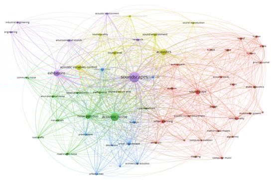 During the analysis of keyword co-occurrences in the 566 documents published between 1985 and 2009, with a minimum threshold of 10 co-occurrences, 60 out of the 2986 identified keywords met the threshold. This analysis produced five clusters as shown in Figure 7. The largest cluster, highlighted in red, consisted of 26 items, focusing on soundscape, human(s), virtual reality, audio acoustics, and public spaces. The second cluster, highlighted in green, included 10 items related to acoustic noise, noise pollution, road traffic noise, environmental noise, and community noise. The third cluster, highlighted in blue, contained 9 items related to architectural acoustics, behavioral research, urban design, and urban soundscape. The fourth cluster, highlighted in yellow, comprised 8 items related to acoustics, acoustic variables control, sound level, and sound quality. Lastly, the fifth cluster, highlighted in purple, included 7 items related to soundscapes, environmental sounds, industrial engineering, engineering, and acoustic environment.