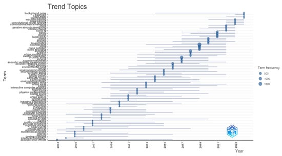 The analysis of keyword co-occurrences revealed that the most prominent keywords were “soundscapes” and “soundscape”, followed by “acoustic noise”, “acoustics”, and “noise pollution” as depicted in Figure 5. In general, three main themes emerged from soundscape research: “soundscape(s), acoustic environment, and urban planning”, “noise, animal(s), bioacoustics, biodiversity, passive acoustic monitoring, fish, and bird(s)”, and “human(s), sound, perception, and physiology”. The trend topics plot indicates that COVID-19 and artificial intelligence techniques such as machine learning, deep learning, and convolutional neural networks have gained popularity in the past three years. Additionally, generative artificial intelligence (AI) holds great potential for capturing people’s perceptions through large language models. Its integration into soundscape research could be transformative, especially since both soundscape ecology and human-focused soundscape studies also rely on descriptive methods.