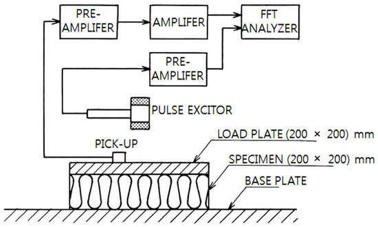 The dynamic stiffness of resilient materials used in apartment buildings for the reduction in floor impact noise was measured in accordance with KS F 2868 (determination of dynamic stiffness of materials used under floating floors in dwellings) [26]. As shown in Figure 2, the test was conducted in a laboratory using the impulse excitation method, where the resonance frequency was identified from the frequency response function of the vibration transmissibility measured by an accelerometer.
