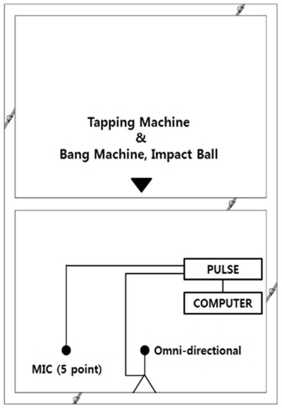 The floor impact noise was measured and evaluated in accordance with KS F 2810-1,2 for the measurement method and KS F 2863-1,2 for the evaluation method, using the standard onsite measurement procedure [27,28,29,30]. The specifications of the measurement instruments used in this study are summarized in Table 4. The impact sources listed in the table are designed to simulate typical floor impact noises encountered in residential settings such as footsteps, dropped objects, and children running or jumping. The impact noise generated in the source room by each device was recorded in the receiving room using microphones, and the data were collected and analyzed through a real-time sound and vibration analyzer. The background noise during the onsite experiment was maintained below 30 dB(A), as the test was conducted in a building managed by the testing institution, where surrounding noise is properly controlled.