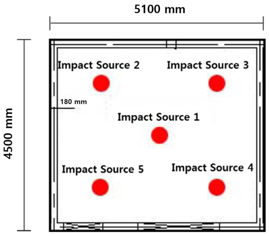 In Figure 5, as follows, the outline diagram of the experiment is illustrated. Five sites were selected for the installation of the impact source in the sound source room, including the center point. It was installed at a distance of 0.75 m from the surrounding walls of the room, and it is shown in Figure 6. Five sites were selected for the installation position of microphones, including the center point of the receiving room. These positions were equivalent to the installation position of the impact source in the sound source room. It was installed at a height of 1.2 m from the floor at sites 0.75 m away from the walls of the surrounding room.