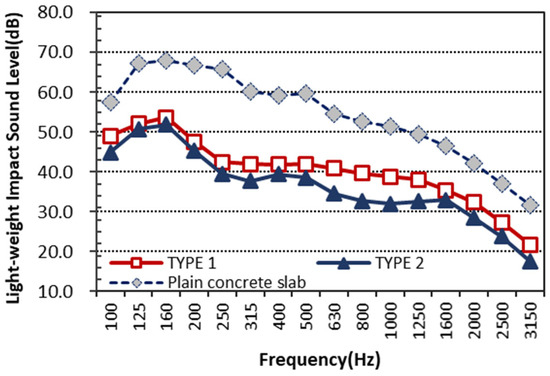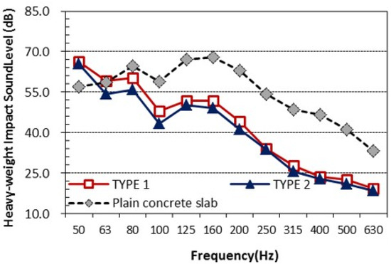 The floor impact noise levels measured using the standard light-weight impact source were calculated in 1/3 octave bands after background noise correction. A comparison graph for the light impact noise level according to the frequency for each floor type is shown in Figure 7. As shown in Figure 5, based on the measured light impact noise levels for Type 2 floors, the reduction performance for the light impact noise was improved. For this reason, according to the study result by K.W. Kim, it was found that, as the thickness of resilient material increased, the reduction performance of the light impact noise increased [4]. Although the total thickness of the resilient layer was 30 mm in both floor types, the effective EPS thickness contributing to light impact noise reduction in Type 2 was estimated to be 3 mm greater than that in Type 1. On the other hand, it was shown from the study result that, if the dynamic stiffness of resilient material increased, the reduction performance of the light impact noise also decreased. However, it was shown that, although the dynamic stiffness in Type 2 floors was higher than that of Type 1 floors, the reduction performance of the light impact noise was excellent.