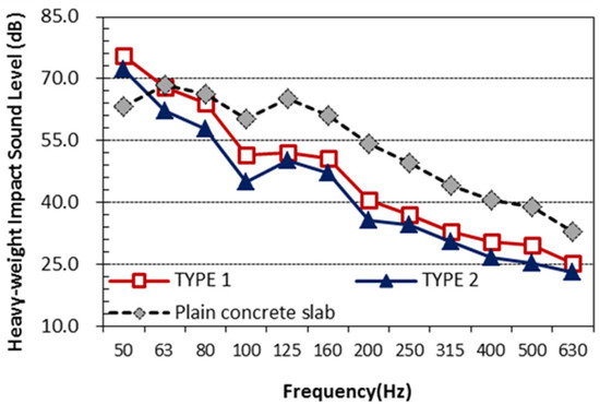 Comparison of heavy-weight impact noise level of Type 1 and 2 floors and plain concrete slab.