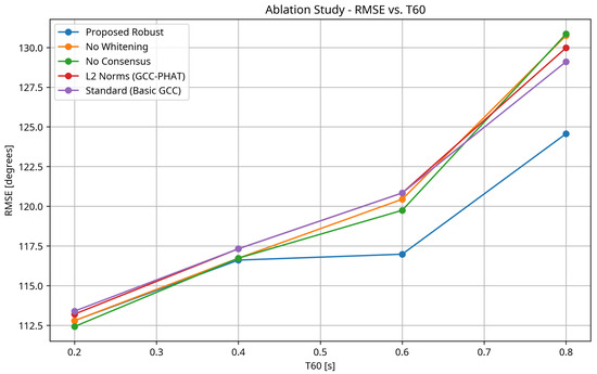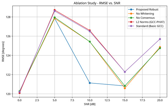 Comprehensive simulations demonstrated that the proposed method significantly outperforms both traditional approaches and modern alternatives such as SRP-PHAT and robust MUSIC, with improvements of up to 30% in RMSE under low SNR and high reverberation conditions. The ablation study confirmed that each component of the method contributes meaningfully to its overall performance, with the TDOA consensus framework providing particularly significant improvements in robustness.