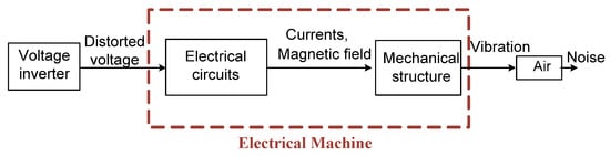 Electric motors constitute a major source of acoustic noise in industry. The increasing noise pollution caused by acoustic interference in electric motors, in general, has become a serious problem. Continuous exposure to noise causes illness and psycho-acoustic problems for human beings. Consequently, considerable efforts have been made to determine the sources of acoustic noise. These can be divided into four main sources: magnetic, mechanical, aerodynamic and electronic, as illustrated in Figure 1. Magnetic noise is generally caused by the deformation of parts sensitive to magnetic fields. One of the main sources of mechanical noise is the stator, which is the main source of noise in the machine. There are also other causes of mechanical noise, which are essentially rotor imbalance and eccentricity. One of the main aerodynamic sources of acoustic noise is the cooling of machines by air, liquid (oil) or water. Thus, electronic noise is caused by switching harmonics when feeding electrical machines. This study focuses on the investigation of electronic noise and consequently on the switching harmonics sources.