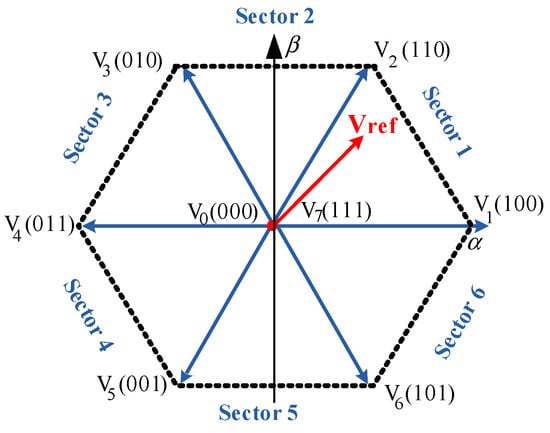 SVPWM is a digital method founded on the transformation of reference voltages by one single vector [1,19,28]. Eight vectors (Vi = 0, …, 7) have two zero vectors. The non-zero vectors in (α, β) are presented in the regular hexagon, where the origin is aligned to the two zero vectors, as illustrated by Figure 4.