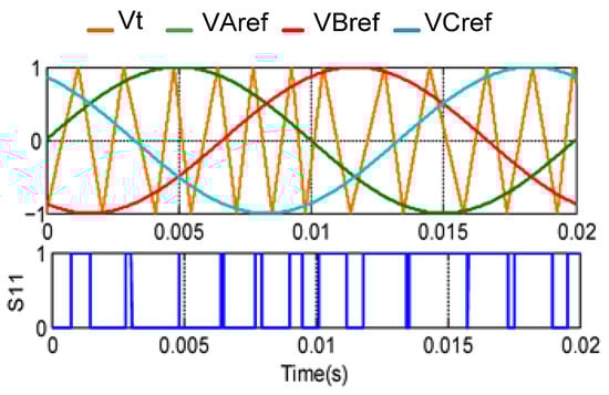 Figure 7 depicts the control signal for switch S11 based on the random frequency algorithm. The control signals for the RPWM strategy are generated by checking the random frequency carrier Vt with the sinusoidal reference.
