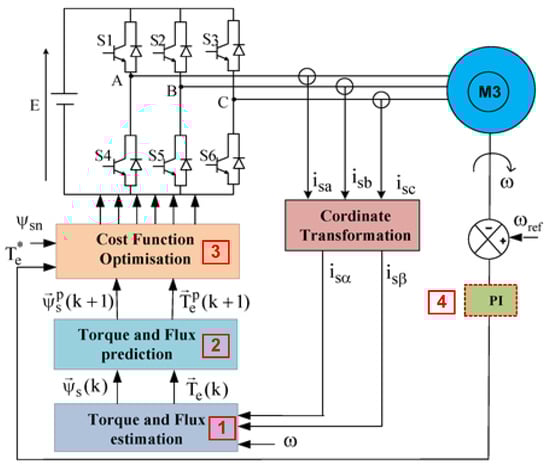 The Predictive Torque Control (PTC) block diagram for an IM drive by a three-phase inverter is given in Figure 8. This approach is carried out in three stages: estimation (1), prediction (2) and optimization (3). The reference torque is generated externally by a PI speed controller (4) [28].