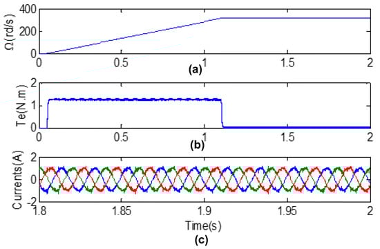 Simulation results obtained from machine controlled by PTC for λp = 1.1: (a) speed, (b) electromagnetic torque and (c) stator currents (ia, ib, ic).
