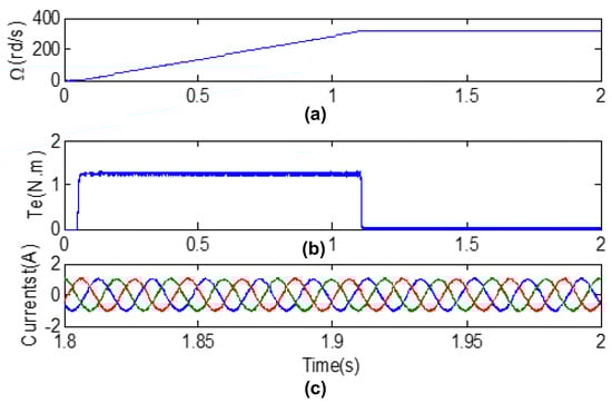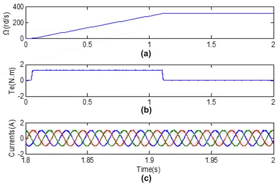 Simulation results obtained from machine controlled by PTC for λp = 5: (a) speed, (b) electromagnetic torque and (c) stator currents (ia, ib, ic).