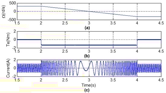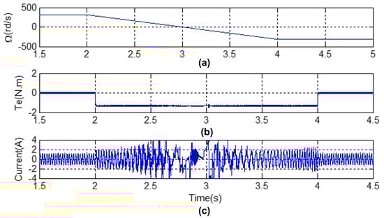 Simulation results obtained from machine with speed reversal for λp = 10: (a) speed, (b) electromagnetic torque and (c) stator current.