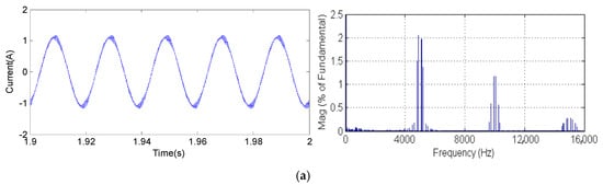 Stator current waveforms and harmonic spectrum using (a) SVPWM, (b) RPWM, (c) PTC for λp = 1.1, (d) PTC for λp = 5 and (e) PTC for λp = 10 at Fc = 5 Khz.