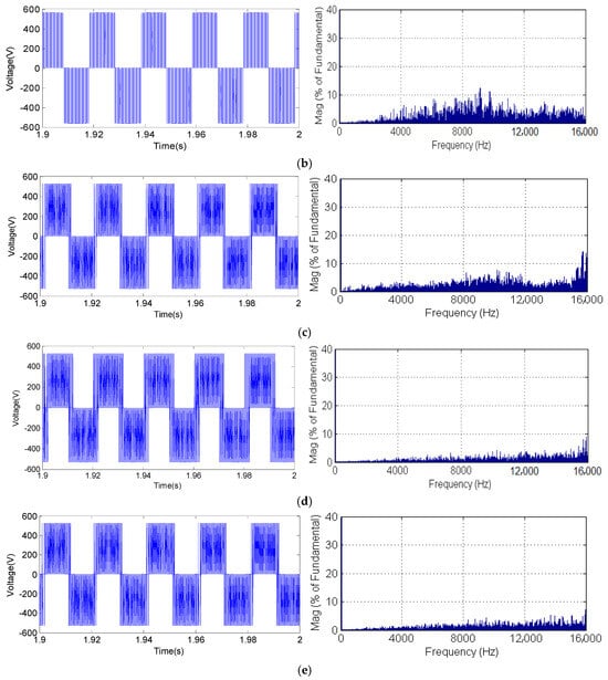 Subsequently, the performance of SVPWM, RPWM and PTC algorithms is evaluated as a function of the current and voltage harmonic content, which represents the source of acoustic noise increase. Figure 16 and Figure 17 depict the current and voltage waveforms and their harmonic spectra, respectively, associated with SVPWM, RPWM and PTC for weighting factors λp = 1.1, λp = 5 and λp = 10. The corresponding obtained THD values are (4.52%, 3.31%, 5.11%, 3.12% and 1.94%) and (70.12%, 50.10%, 50.99%, 32.84% and 32.30%), respectively, for current and voltage. Based on the obtained results, it can be clearly observed that for SVPWM, there is high harmonic near the switching frequency and its multiples. In addition, with RPWM control, it is noted that there is a significant reduction at the harmonic level compared to SVPWM. The harmonic current spectrum is entirely dispersed over the whole frequency band, and the range near the switching frequency and its multiples vanishes. Yet, for PTC, as illustrated in the results given in Figure 16 and Figure 17, under the same control parameters, current qualities are comparable. Moreover, we can clearly observe that the band around the switching frequency and its multiples disappears, and the spectrum is totally spread better over the entire frequency band. In addition, for λp = 10, the THD is reduced, and the spectra disperse well over wide frequency ranges, which confirms their effectiveness in terms of acoustic noise reduction compared to the other controls.