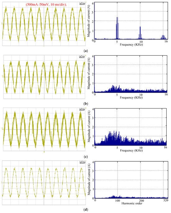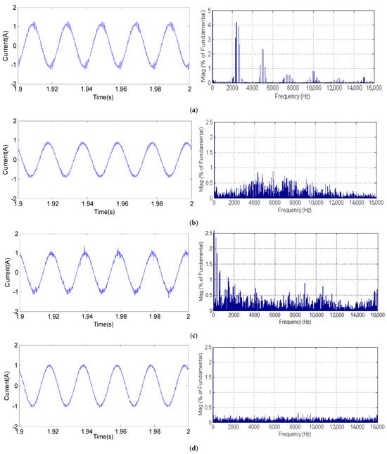 Experimental stator current waveforms and harmonic spectrum using (a) SVPWM, (b) RPWM, (c) PTC for λp = 1.1 and (d) for λp = 10.