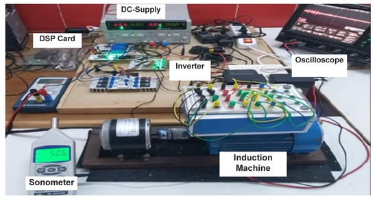 For several years, the investigation for greater performance of induction machines fed by inverters has been the topic of numerous research studies. The effect of acoustic noise generated by the static converter Induction Machine (IM) association has always constituted a prominent research topic [4,5,6,7,8,9,10,11]. This phenomenon has been studied since the introduction of electronic converters. A large part of noise is of electronic origin. Few books on the subject have been published [1,12,13]. The work of [1], published in 2006, constitutes today a basic element for the study of noise emitted by asynchronous machines. A lot of studies have appeared in the literature suggesting an acoustic model of the asynchronous machine, without generally taking into account the type of Pulse Width Modulation (PWM) control used. Recent work has shown that each control strategy generates a different acoustic noise spectrum [2,3,4,5,6,7,8,9,10,11,14,15,16,17,18,19,20,21]. The work recapitulated in reference [14] presented a comparative study between sinus PWM and Space Vector PWM (SVPWM) techniques in terms of acoustic noise. Nevertheless, the subject has remained a great topic, as shown by recently published studies [5,6,7,8,9,10,11,16,18,19,20]. In the same vein, the authors in [14] reported an experimental study on the effect of inverter switching sequence on acoustic noise. The studied modulation techniques were continuous SVPWM and advanced bus-clamping PWM for different switching sequences. The authors in [16] proposed an experimental procedure to define the acoustic and vibratory behavior of an IM fed by a three-phase inverter and controlled by the SVPWM modulation method. They concluded that this technique would produce harmonic components in the narrow bands around integer multiples of the switching frequency, which led to the acoustic components of tone-frequency noise that irritated the human ear. On the other hand, the authors in [8] put forward an experimental study of the carrier frequency influence of sine-triangle PWM on the forces applied to the bearings and on the noise emitted by the stator. The authors in [11] suggested a hybrid periodic carrier frequency modulation technique based on the SVPWM technique.