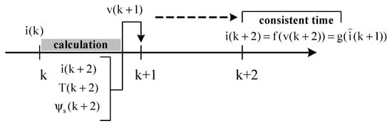 In the experimental implementation of predictive control, there exists a temporization problem, because the algorithm cannot be executed at the first period t(k). The stator current is first measured at the sampling instant (k). Next, the estimations, predictions and optimization of the cost function are calculated. Thus, the selected voltage vector is not available before time t(k + 2). Accordingly, the calculation time of the algorithm must introduce the delay time that needs to be compensated. This is achieved through two prediction steps (k + 2) [28,29,30,31]. The compensation method is described in Figure 21.