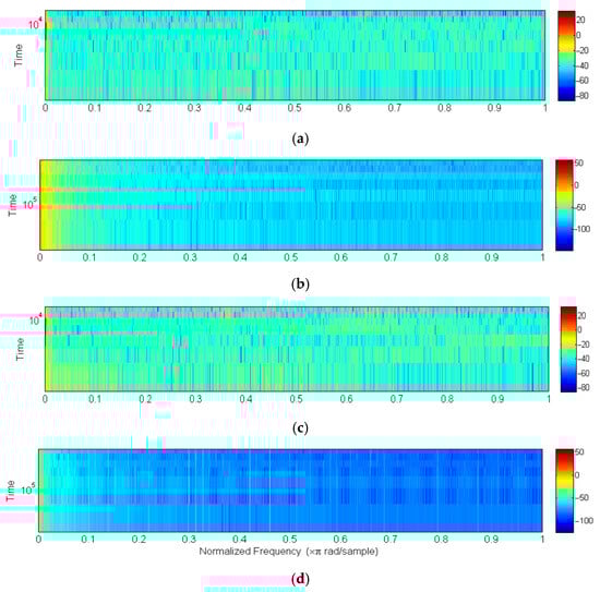 Measured current spectrogram using (a) SVPWM, (b) RPWM, (c) PTC for λp = 1.1 and (d) for λp = 10.