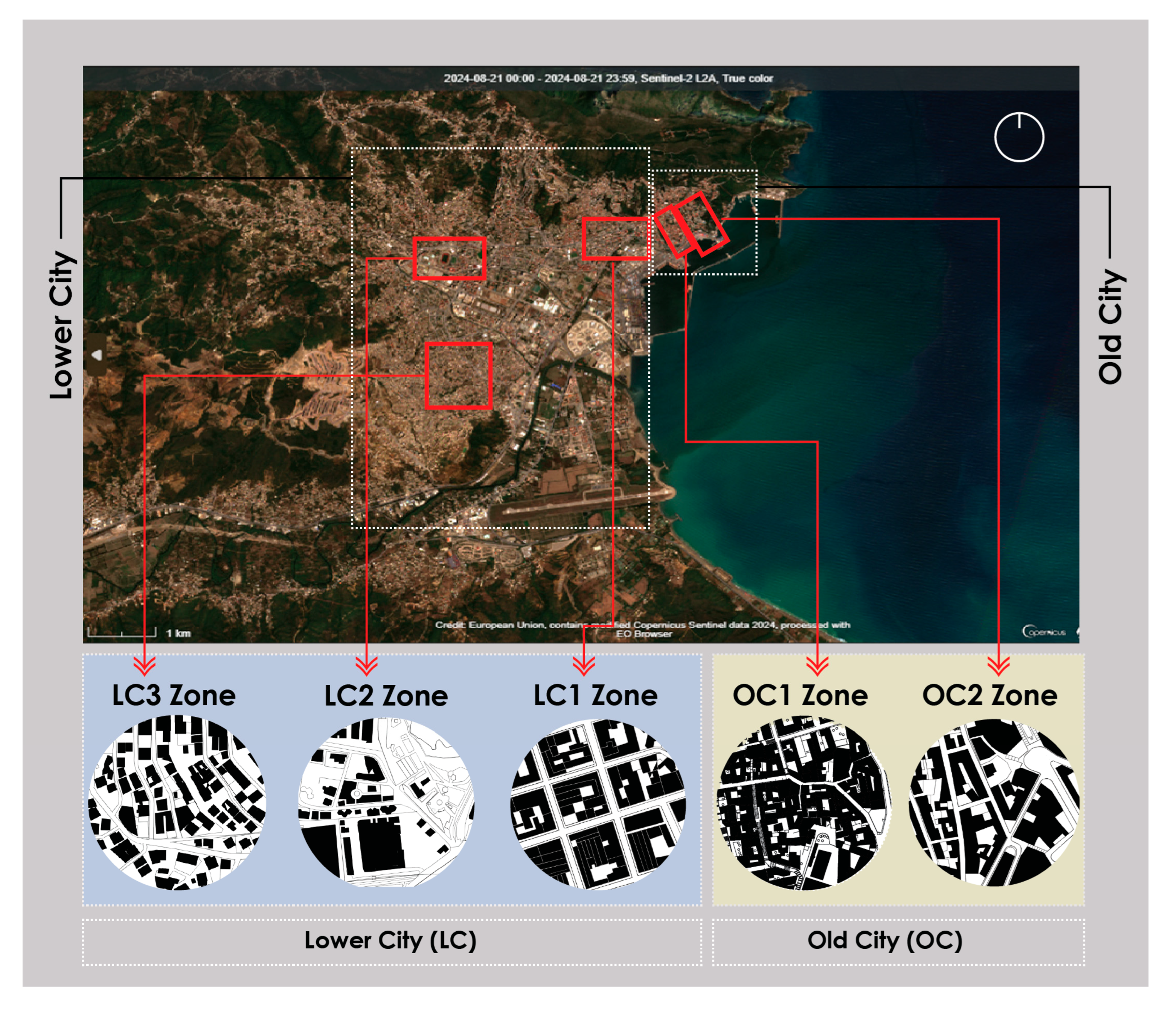 - The Old City (OC): A historic city built before the independence of Algeria (before 1962). It contains old and historical urban fabrics as well as a rich architectural and cultural heritage (Figure 1a).