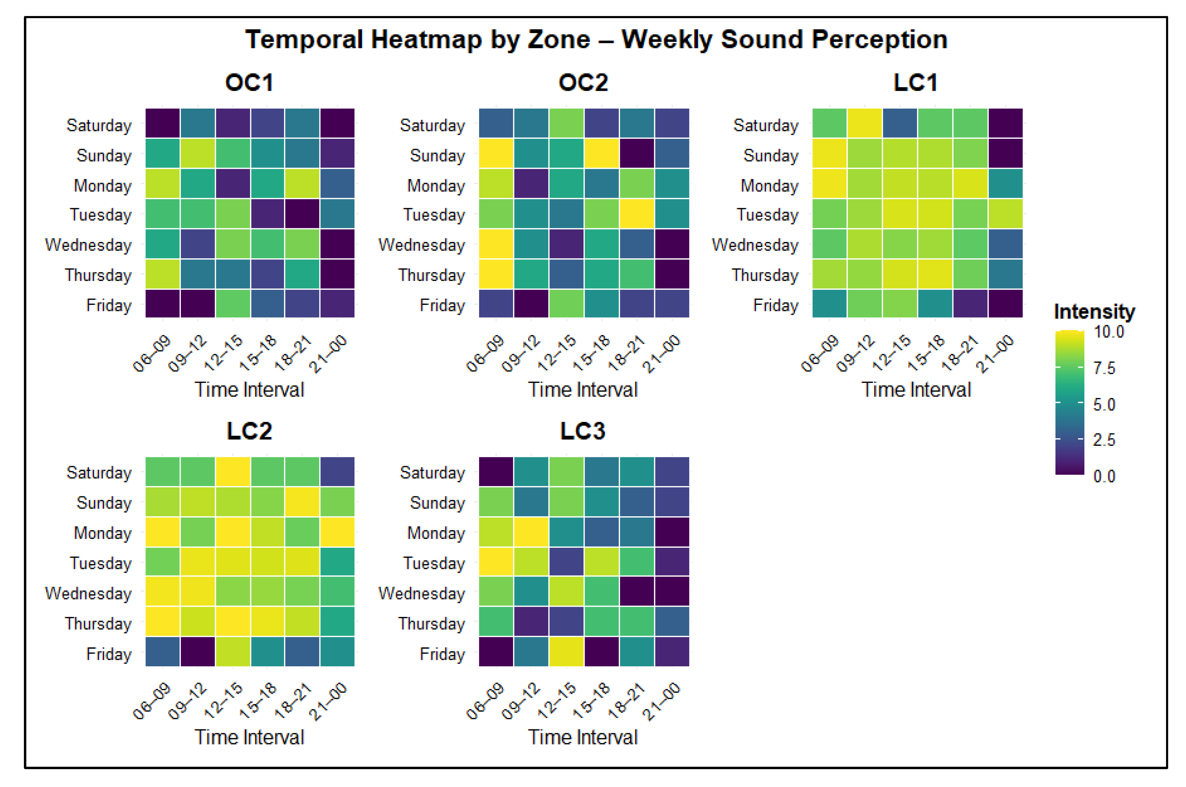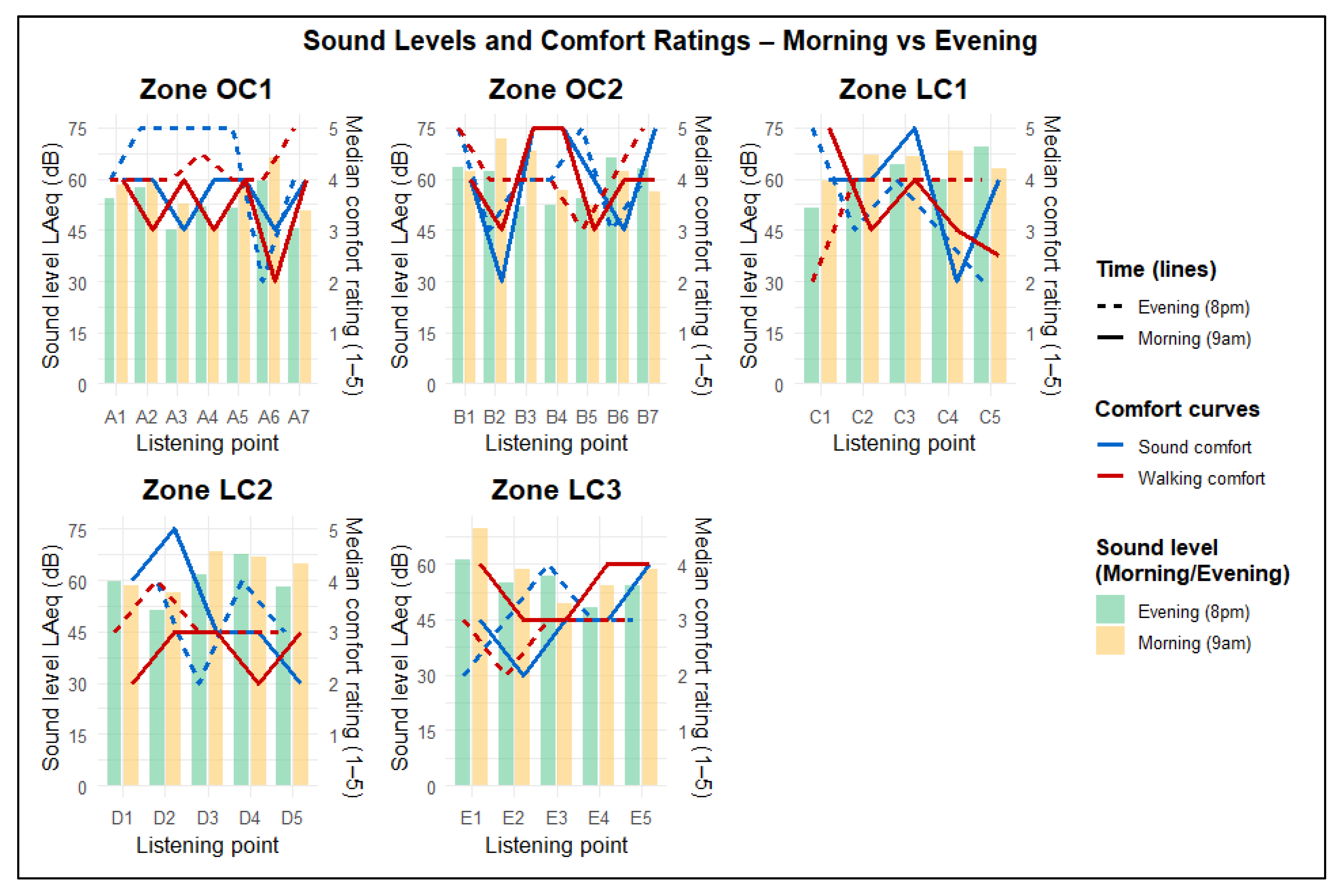 4.4.3. Comparison of Sound Levels and Perceived Comfort Across Time Periods and Urban Zones