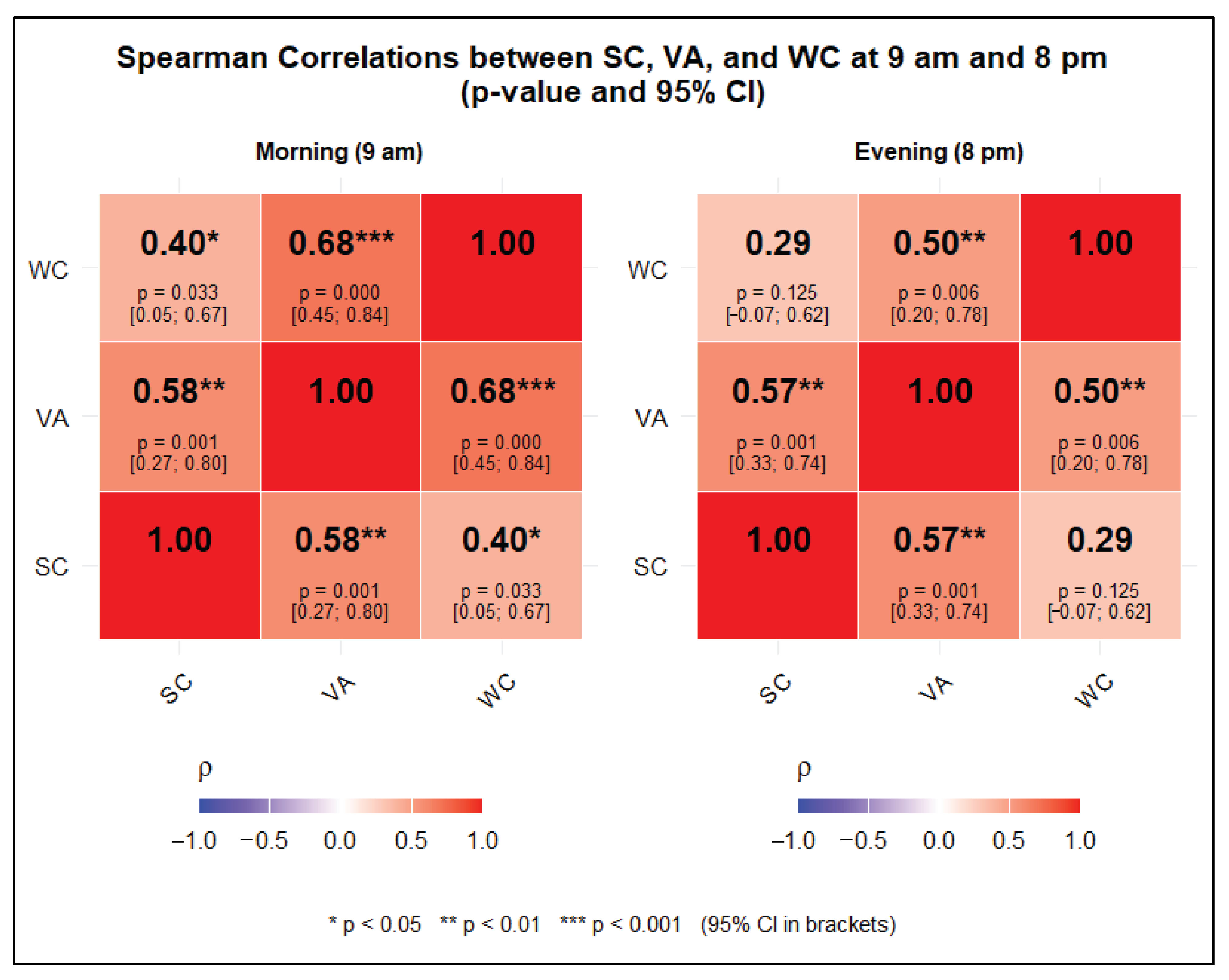 4.4.4. Study of the Correlation Between Sound Comfort (SC), Visual Ambiance (VA), and Walking Comfort (WC)
