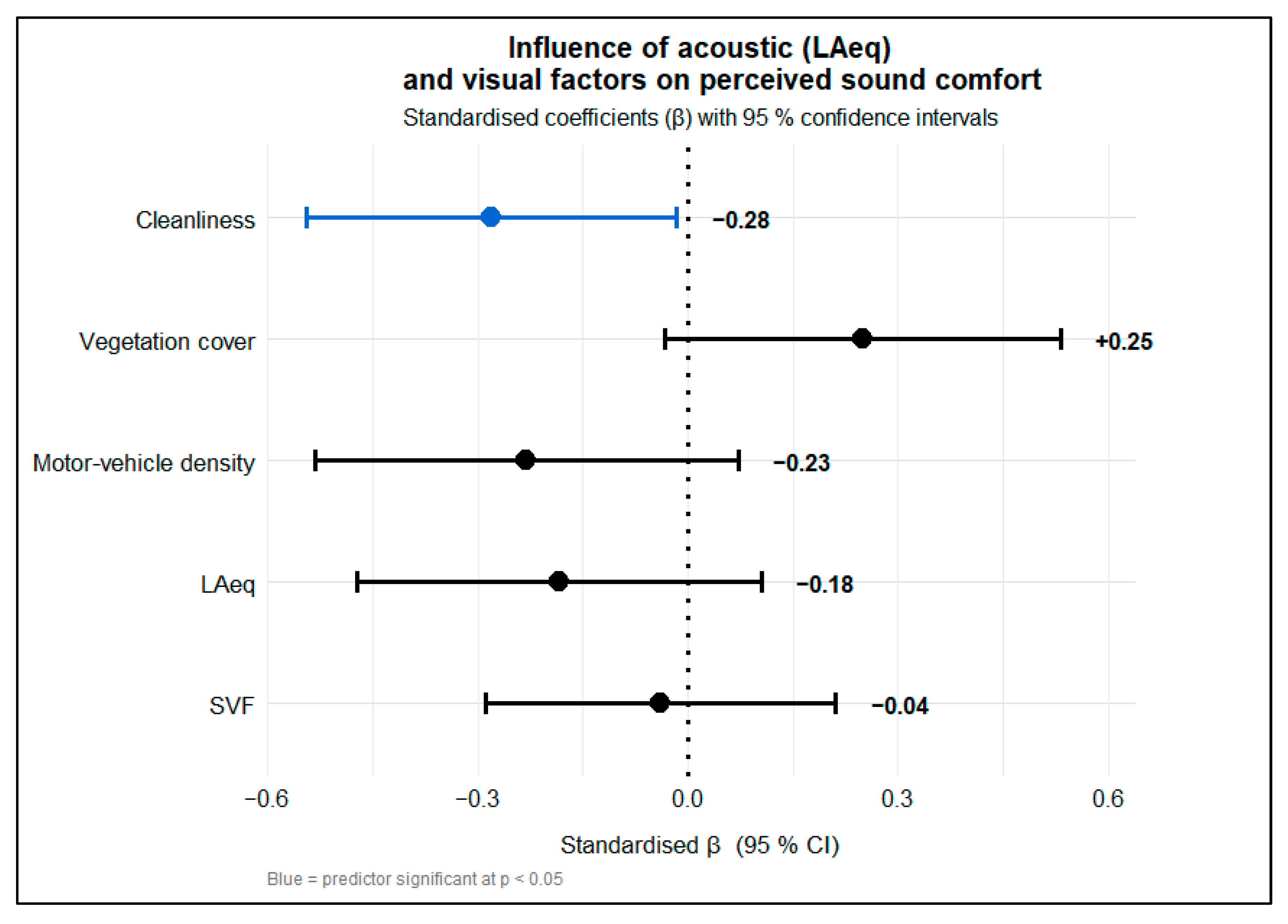 - Zhou, Z.; Tian, J.; Zhu, Y.; Kang, J. Impact of Visual Factors on Soundscapes in Pedestrian Spaces along Trunk Roads. Transp. Res. Part D Transp. Environ. 2025, 139, 104583. [Google Scholar] [CrossRef]