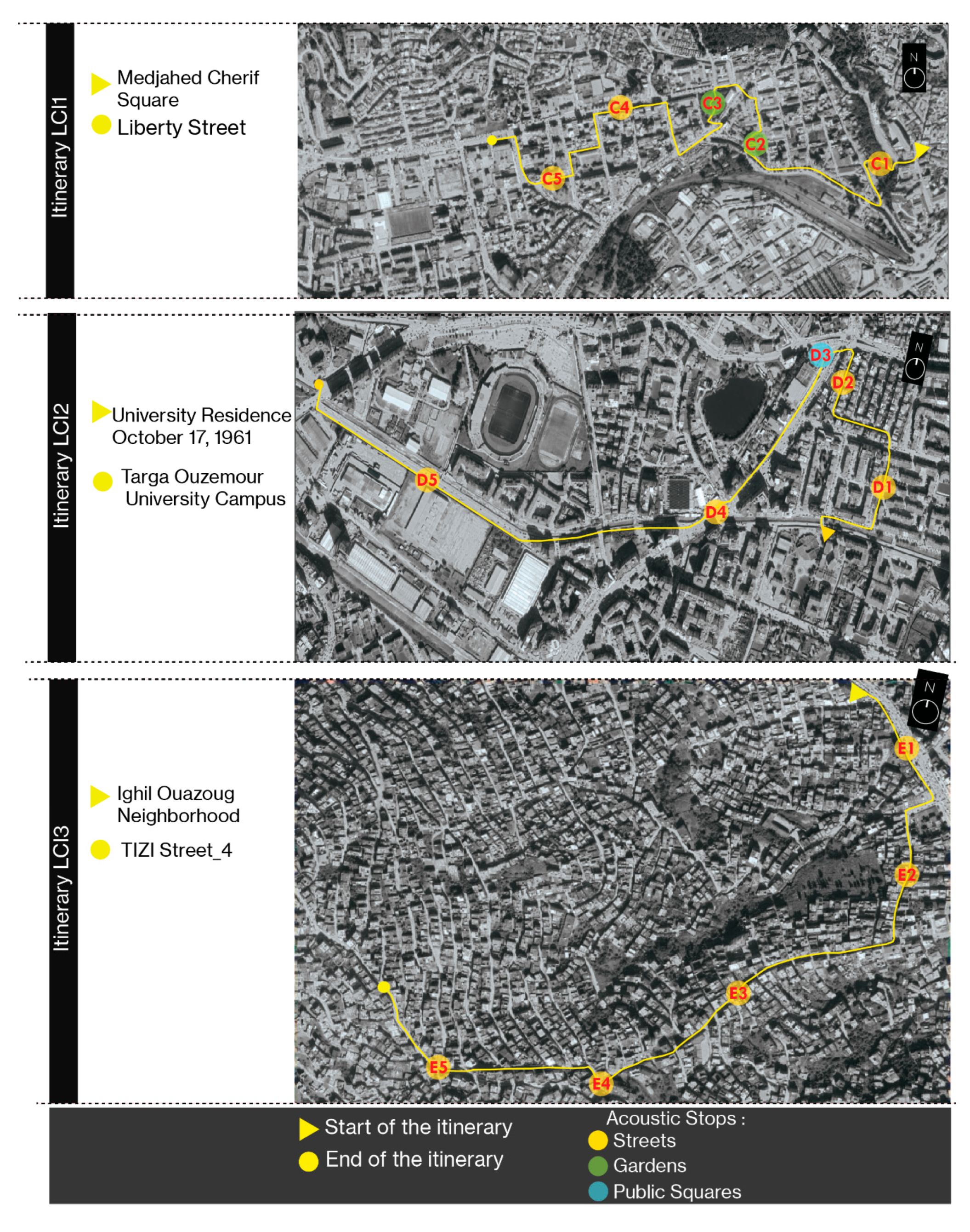 - Ikni, K.; Debache-Benzagouta, S.; Woloszyn, P. La chronotopie du paysage sonore urbain des places publiques: Le cas de la place 1er novembre 1954 à Béjaïa (Algérie). Cybergeo: Eur. J. Geogr. 2020, 942. [Google Scholar] [CrossRef]