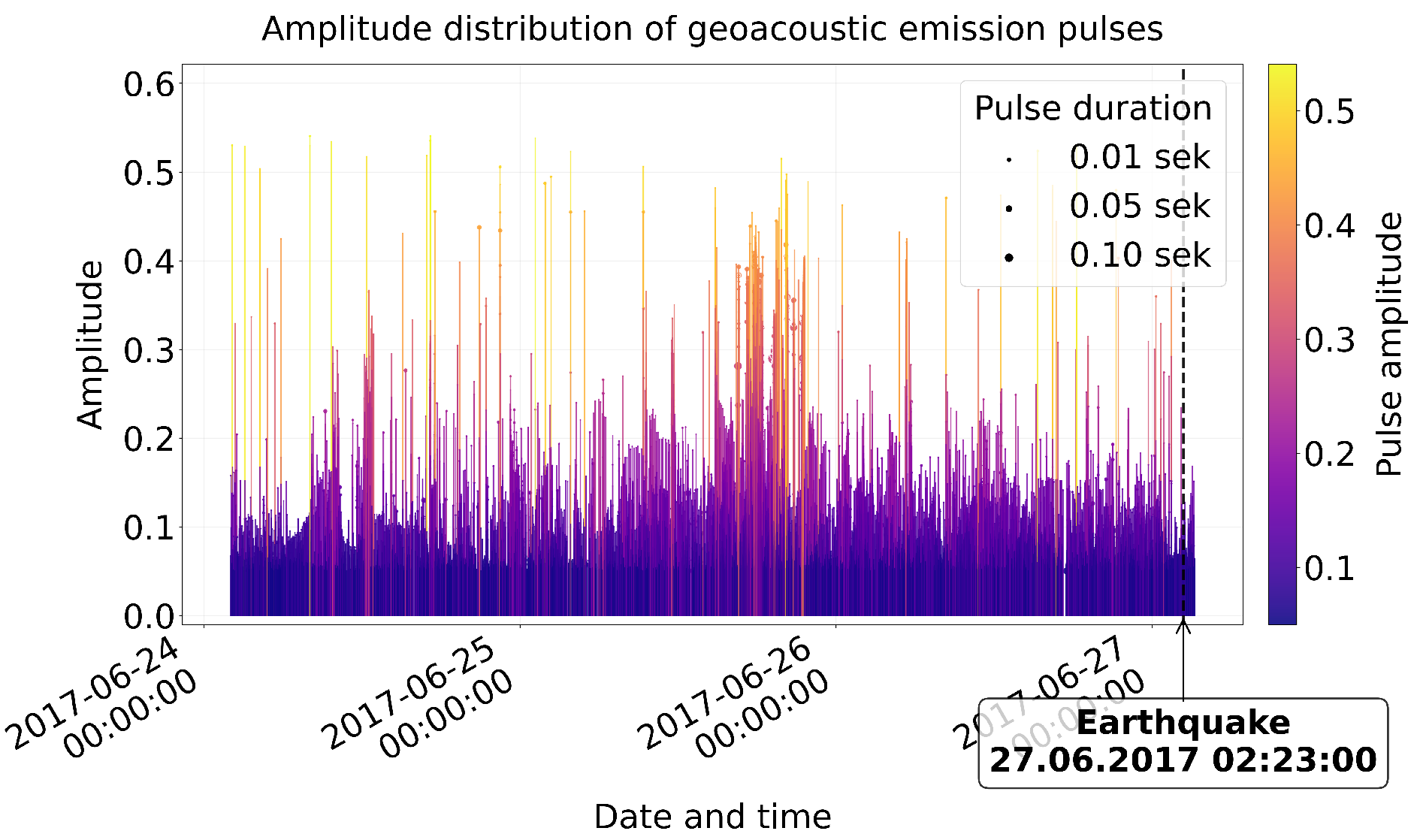 Figure 4a you can see that 2 days before the earthquake (25.06) pulse activity already exceeded background values, but had a more chaotic nature without a clear temporal structure. For 48 h the appearance of individual high-amplitude pulses is observed, and for 36 h—the frequency of pulses and the growth of their amplitude. In the 24 h prior to the earthquake, 259,747 geoacoustic emission pulses were analyzed and 63,301 pulses (24.4%) similar in shape on Berlage functions were identified.