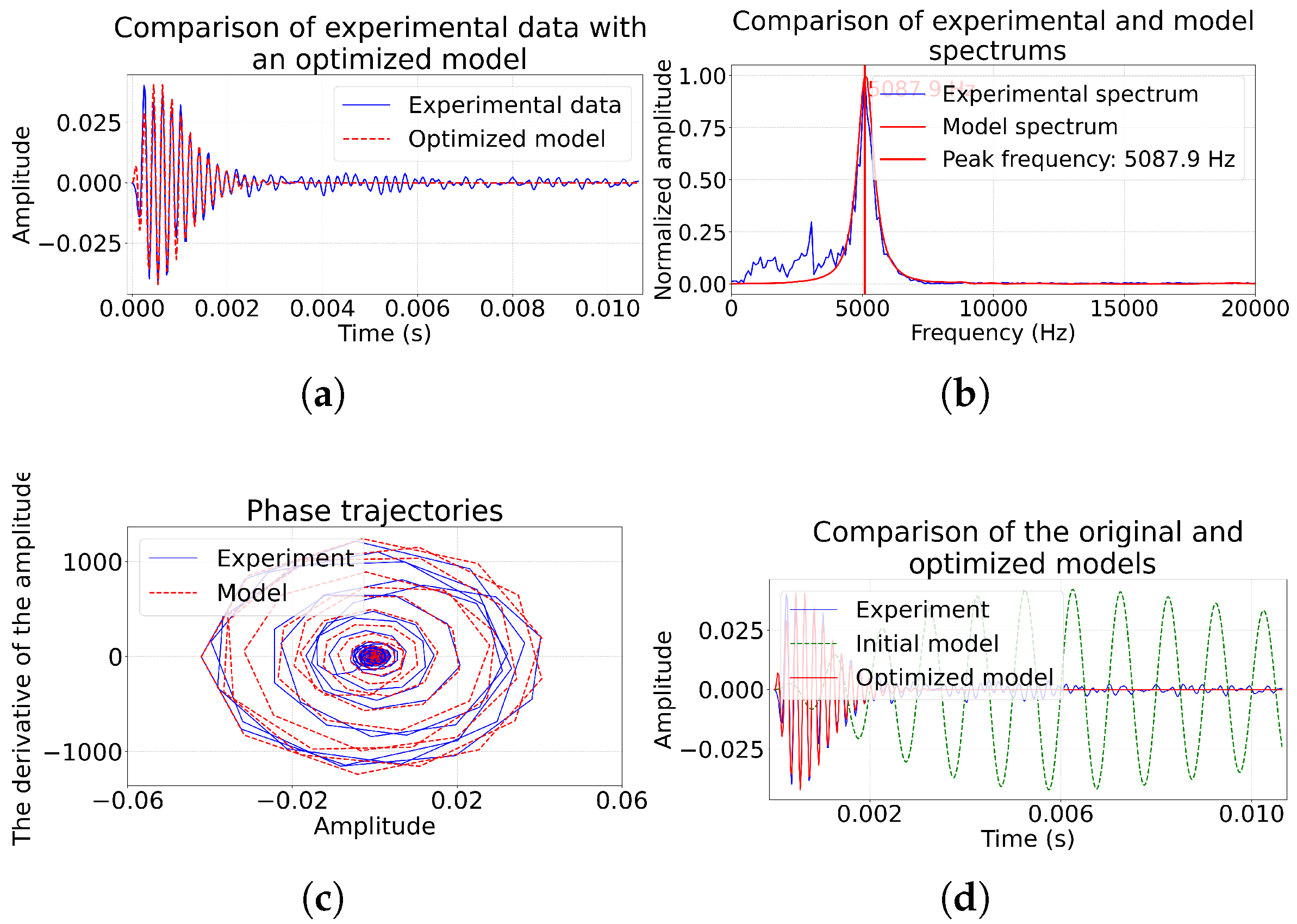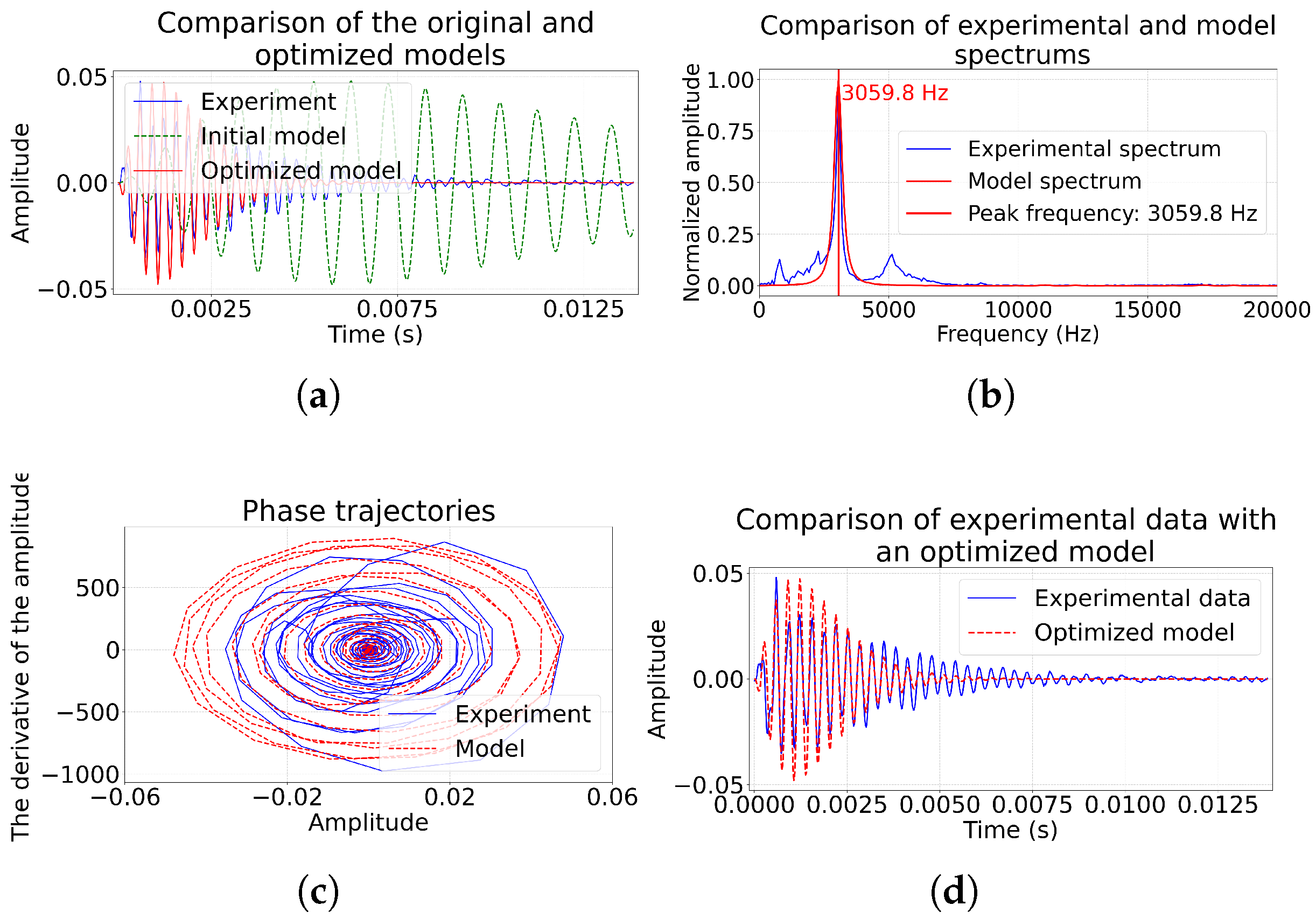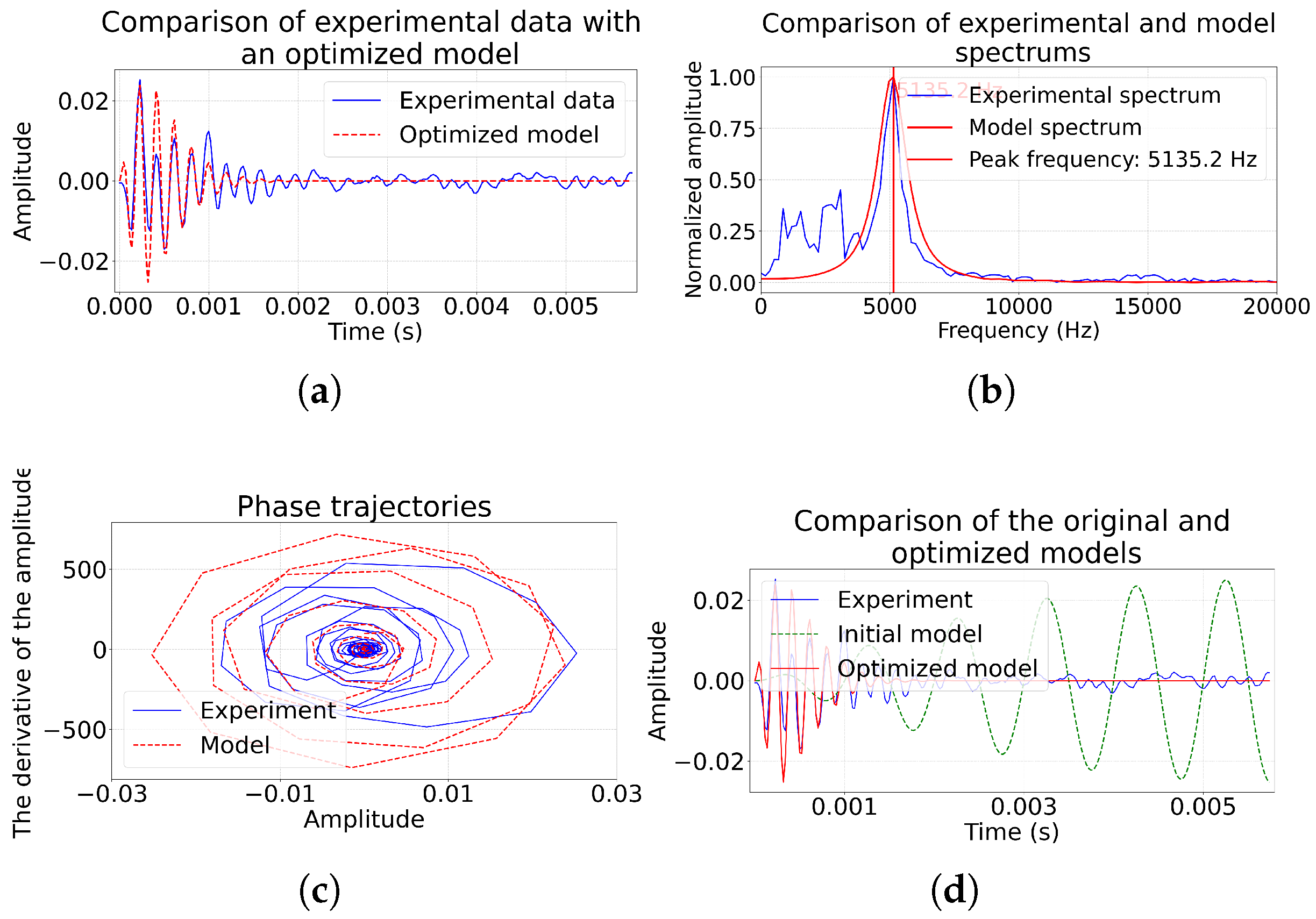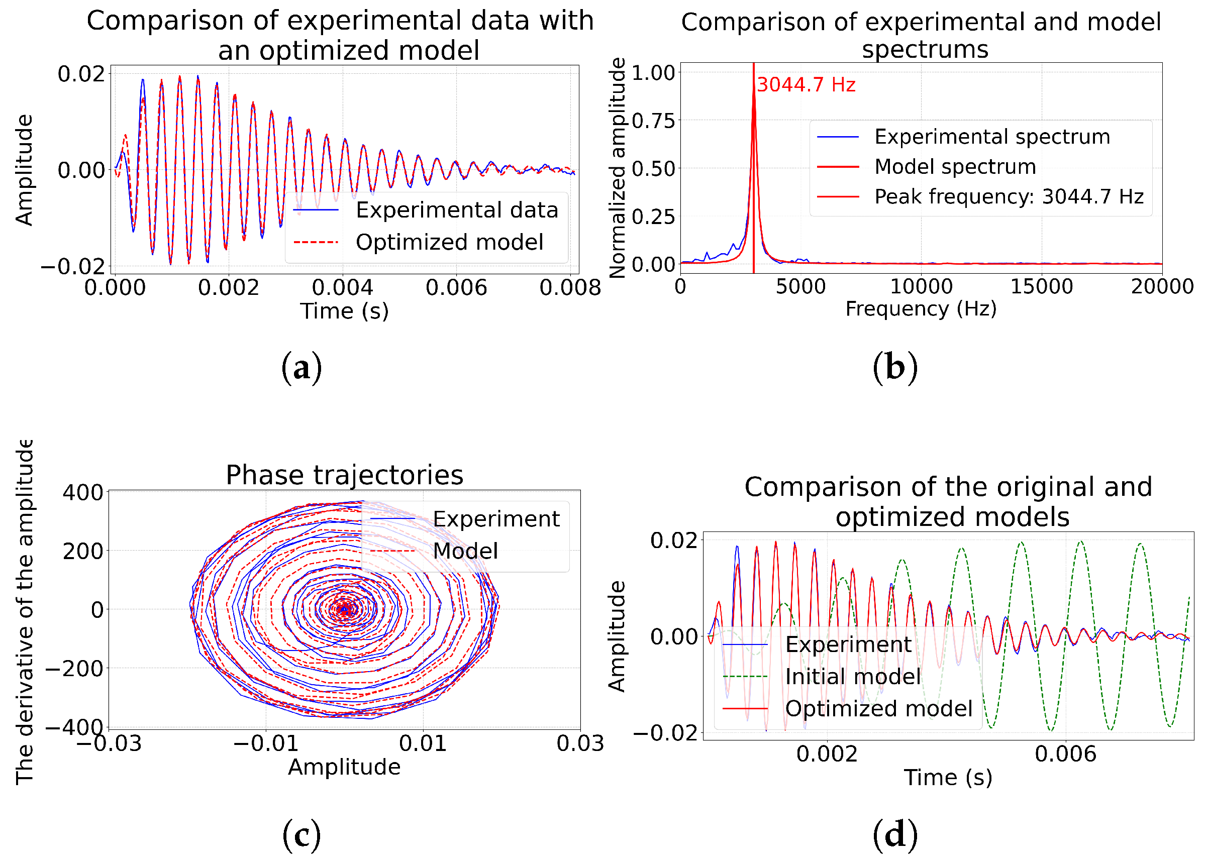 Figure 3). A visual comparison of the time realizations of experimental and model data makes it possible to assess the correspondence not only of the amplitudes, but also of the phase dynamics of the pulses. The comparison of the amplitude spectra provides control over the reproduction of the frequency characteristics of the source, and the analysis of the phase trajectories makes it possible to verify the correctness of the description of the oscillatory dynamics of the system. This complex approach compensates for the limitations of MSE and increases the reliability of the physical interpretation of the found model parameters.