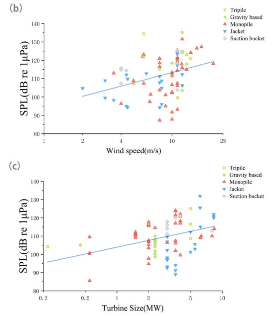 The constant C represents the average SPL of all measurements, normalized to a distance of 100 m, a turbine power of 1 MW, and a wind speed of 10 m/s. The SPL data used for the subsequent summary analysis are all normalized data []. α, β, and γ are coefficients corresponding to the independent variables, respectively, reflecting the degree and direction of the impact of each independent variable on the sound pressure level (SPL). For example, α represents the contribution of the logarithmically transformed distance to the change in sound pressure level. The positive or negative sign of the coefficient indicates whether the impact is a positive or negative correlation, and the absolute value indicates the strength of the impact. Measurements were conducted using different methods at varying water depths, and the seafloor topography and sediment types vary across wind farms. These factors can affect the recorded SPLs. Since there is currently no precise method to eliminate this interference, it is considered a source of measurement uncertainty.