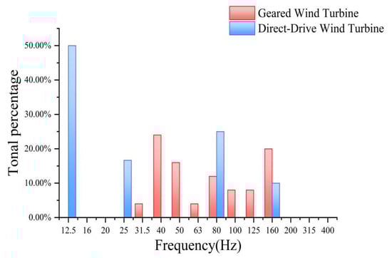 In addition, this study also examined the main frequency distribution of direct-drive turbines and geared turbines within offshore wind farms. Direct-drive turbines exhibit more low-frequency components, which is consistent with their operating characteristics []. Since the speed of the direct-drive generator is relatively low, the low-frequency components are relatively rich. In contrast, the geared turbine converts the low-speed rotation of the rotor into the high-speed rotation of the generator through the speed-increasing gearbox, so less energy is distributed in the low-frequency range [,]. As the frequency increases, the frequency distribution of the two turbine types changes significantly. In Figure 2, it is evident that the dominant frequency of the geared turbine noise falls within a relatively high-frequency range, displaying a relatively dispersed distribution. This indicates that the energy distribution of the geared turbine is more concentrated in the high-frequency band, which is closely related to its characteristic of achieving high-speed operation through the speed-increasing gearbox.