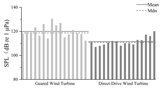 All the noise levels discussed above are generated by geared turbines, but many modern turbines operate using direct-drive technology. Since the gearbox is one of the main noise sources, it is expected that a direct-drive turbine will produce lower noise levels. According to the monitoring results of 6 MW direct-drive wind turbines at Block Island Wind Farm by Elliott et al., the gearless design significantly reduces high-frequency noise [], and the SPL is 10–15 dB lower than that of geared turbines with the same power. Stöber et al. compared a 6 MW direct-drive turbine with a 6.15 MW geared turbine and found that the average SPL of the direct-drive turbine was about 10 dB lower than that of the geared turbine []. The data comparison in this paper is shown in Figure 3, and it is found that the average SPL of a geared turbine is about 9 dB higher than that of a direct-drive turbine, which is generally consistent with expectations. In evaluating the impact of offshore wind farms on the marine environment, it appears that further noise reduction measures may be required for geared turbines to mitigate potential disturbances to marine life.