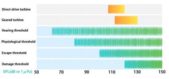 As a major form of renewable energy utilization, offshore wind power generation has been widely used around the world. Although the growth rate has been adjusted recently due to economic slowdown, the trend of accelerated development in the future is still clear [,]. At the same time, the potential impact of underwater noise generated by the operation of offshore wind turbines on marine life and ecology has also become a focus of research. Studies have shown that the underwater noise generated by offshore wind turbines will have a negative impact on the surrounding ecological environment and fishery resources [,,,]. The noise from pile driving during construction can exceed an SPL of 200 dB re 1 μPa (hereafter referred to as dB) [], which may cause physiological damage to marine mammals and fish in the vicinity of the construction site. Its broadband noise may also have a serious impact on high-frequency-sensitive marine mammals such as dolphins [,,,]. For example, it was found that harbor porpoise (Phocoena phocoena) exposed to pile driving noise exhibited increased respiratory rates and obvious avoidance behavior [,]. The impact of relatively low noise levels during operation on marine ecosystems has attracted less attention [,,,,,,]. Studies have shown that underwater noise during the operation of offshore wind farms not only causes fish and marine mammals to avoid the noise [], but may also cause hearing damage and lead to a shift in hearing thresholds [,,,,,,].