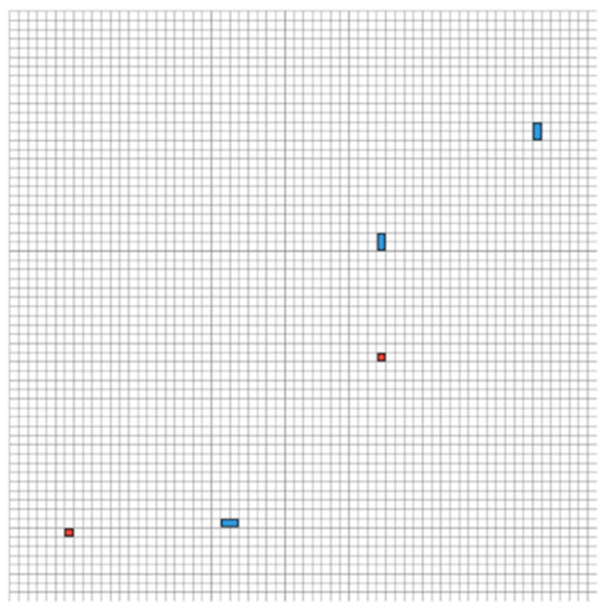 The microphone array layout is shown in Figure 2, while Figure 3 illustrates a randomized source configuration. Monopoles occupy a single red grid cell, whereas dipoles span two adjacent cells—horizontally for x-direction and vertically for y-direction dipoles—visually distinguished by blue horizontal and vertical pairs, respectively, to emphasize their directional characteristics. Each sample was guaranteed to contain at least one monopole and one dipole, with dipole types selected randomly. Overlapping of grid cells between different sources was not permitted.