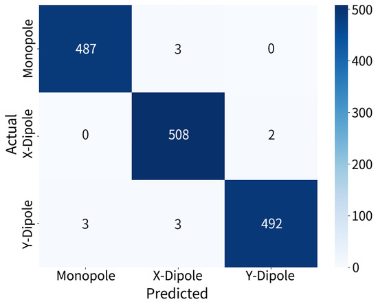 The overall confusion matrix results are shown in Figure 4 which indicates that the model achieves excellent differentiation among the three source types. The number of correctly identified monopoles, -direction dipoles, and -direction dipoles reached 487 out of 490, 508 out of 510, and 492 out of 498, respectively. The overall misidentification rate is extremely low, with minor confusion observed only between - and -direction dipoles. Notably, no systematic misidentification of monopoles as dipoles is observed.