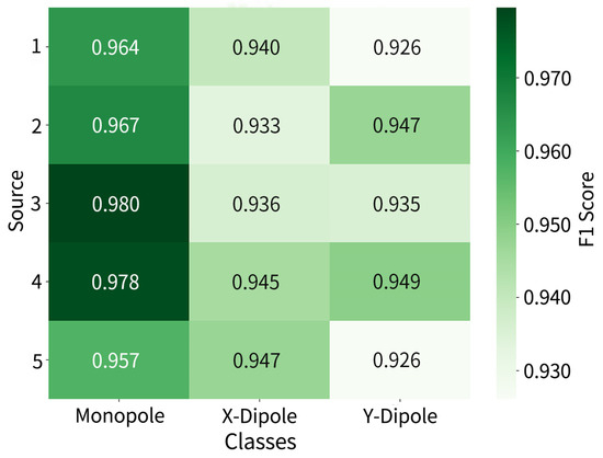 The results under the setting of five fixed sound sources are shown below. The confusion matrix is illustrated in Figure 7, the number of correctly identified sources for each class is as follows: 470 out of 485 for monopoles, 475 out of 504 for -direction dipoles, and 478 out of 511 for -direction dipoles. The overall misidentification rate remains low, though slightly higher than that observed in the two-source scenario, with a noticeable increase in mutual misidentification s between dipole types. The F1-score heatmap further is shown in Figure 8 which reveals the identification performance distribution of each source across different categories, with scores generally ranging from 0.926 to 0.980. Monopoles remain the most consistently recognized category, while the F1-scores for x- and -direction dipoles are slightly lower, primarily due to the similarity in their spatial radiation patterns.